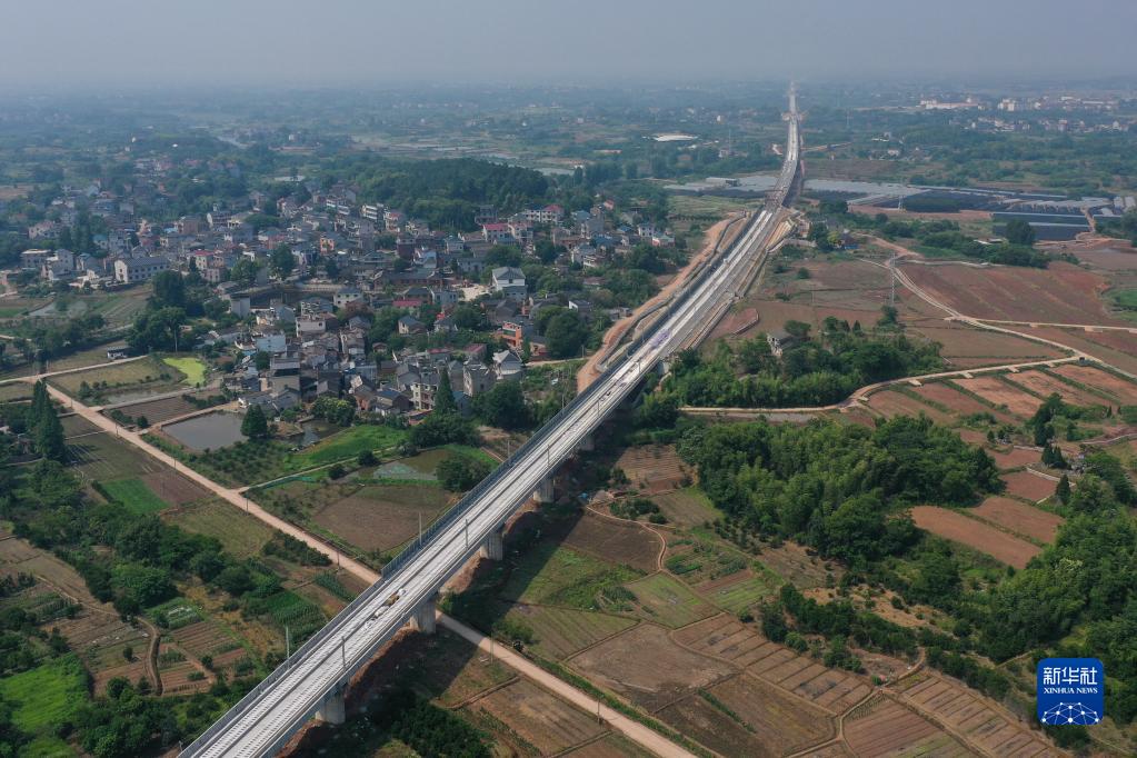 5月30日在浙江省龍游縣境內拍攝的杭衢鐵路無(wú)砟軌道施工現場(chǎng)(無(wú)人機照片)。