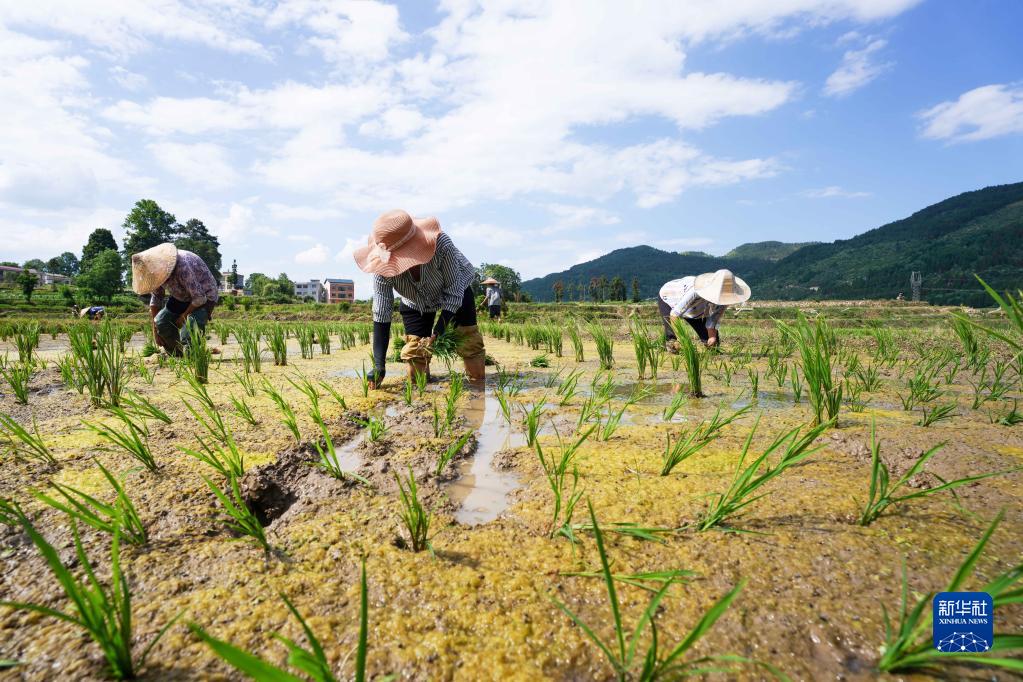 5月29日,村民在岑鞏縣水尾鎮新場(chǎng)村的雜交水稻制種基地移栽制種水稻秧苗。
