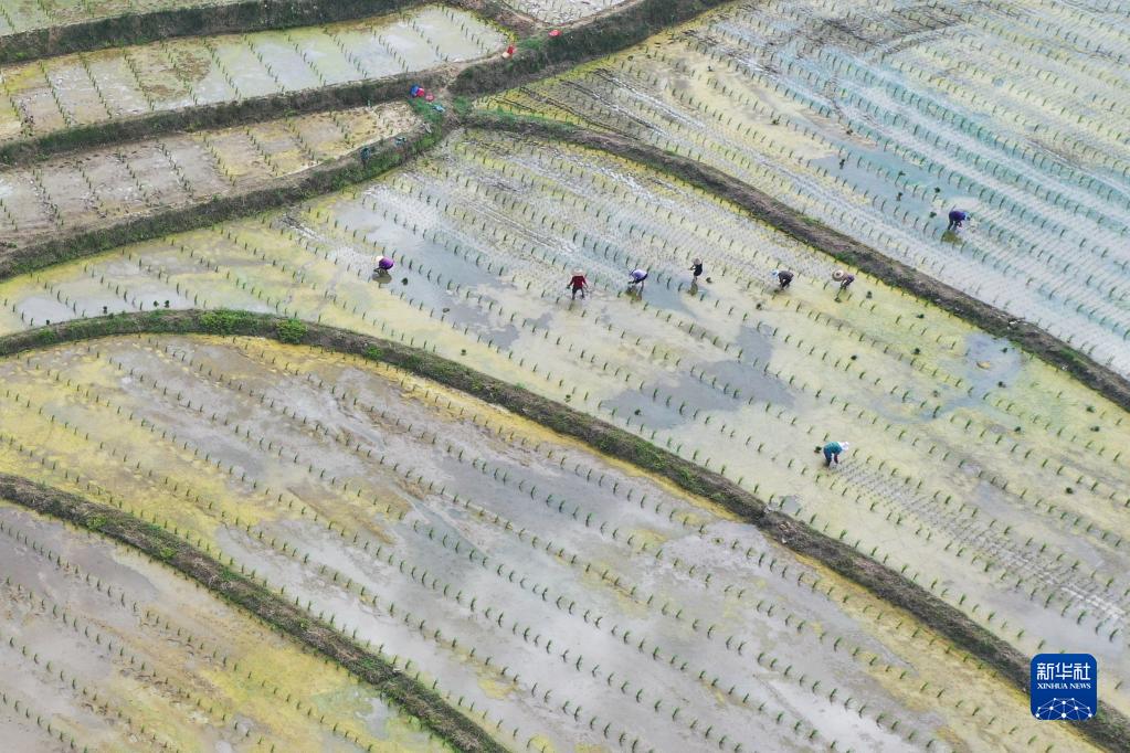5月29日,村民在岑鞏縣水尾鎮新場(chǎng)村的雜交水稻制種基地移栽制種水稻秧苗(無(wú)人機照片)。