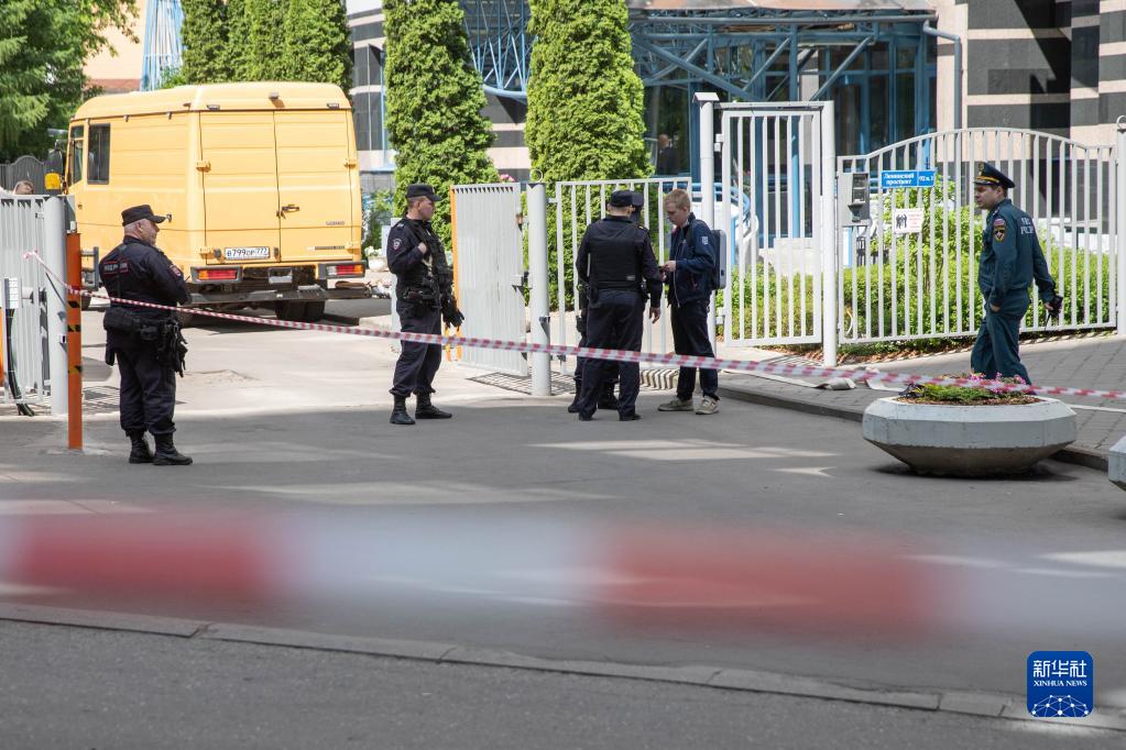 5月30日,警察在俄羅斯首都莫斯科的樓房遭襲現場(chǎng)警戒。