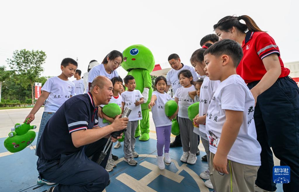 5月30日,在天津空港經(jīng)濟區西十四道綜合加能站,工作人員帶領(lǐng)小朋友參觀(guān)氫氣加注設備。