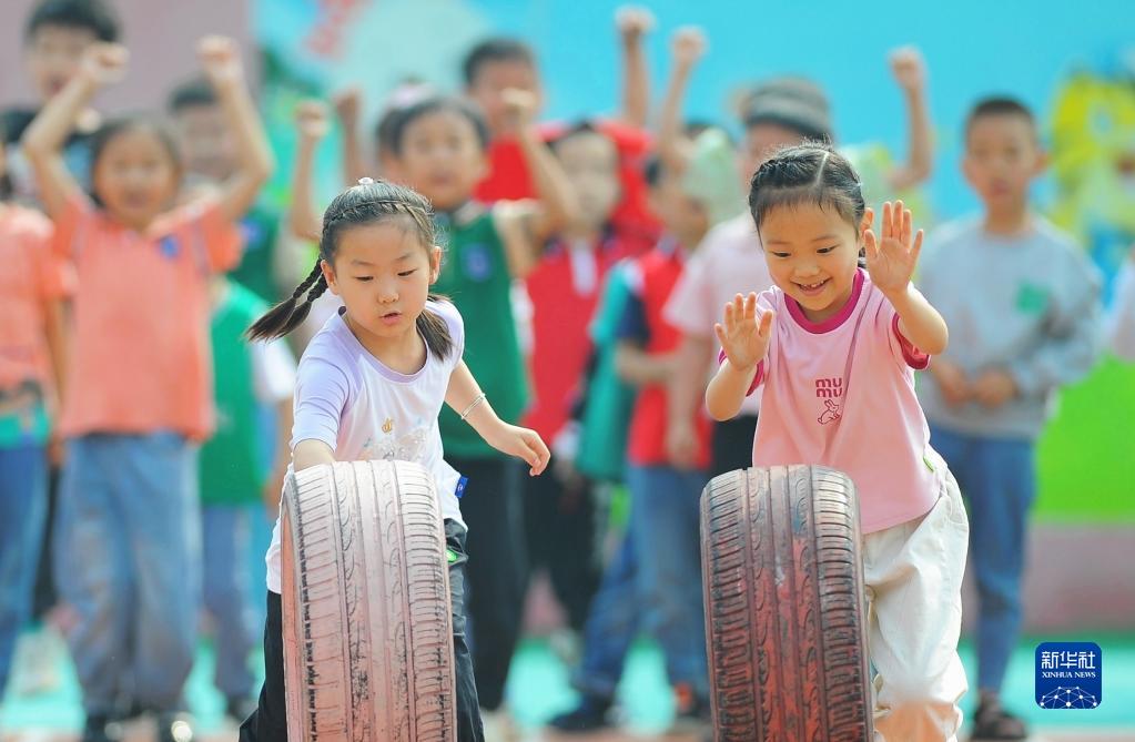 5月31日,在山東省滕州市西崗鎮一所幼兒園,小朋友在進(jìn)行滾輪胎比賽。