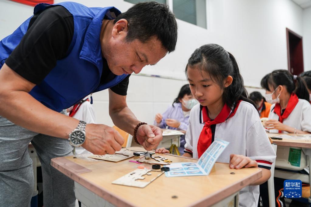 5月31日,在北京市東城區分司廳小學(xué)舉行的2023年?yáng)|城區青少年科技館“玩轉科學(xué) 童心筑夢(mèng)”科技嘉年華活動(dòng)上,老師幫助同學(xué)制作太陽(yáng)能小車(chē)。