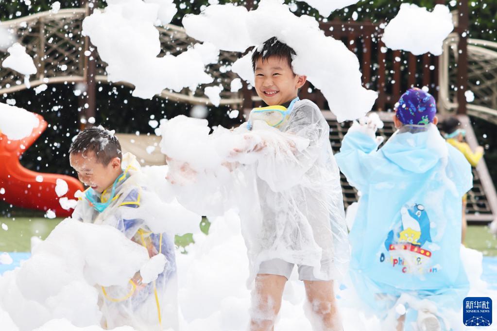 5月31日,在南京市金陵華興實(shí)驗幼兒園,小朋友們在“泡泡派對”上玩耍。