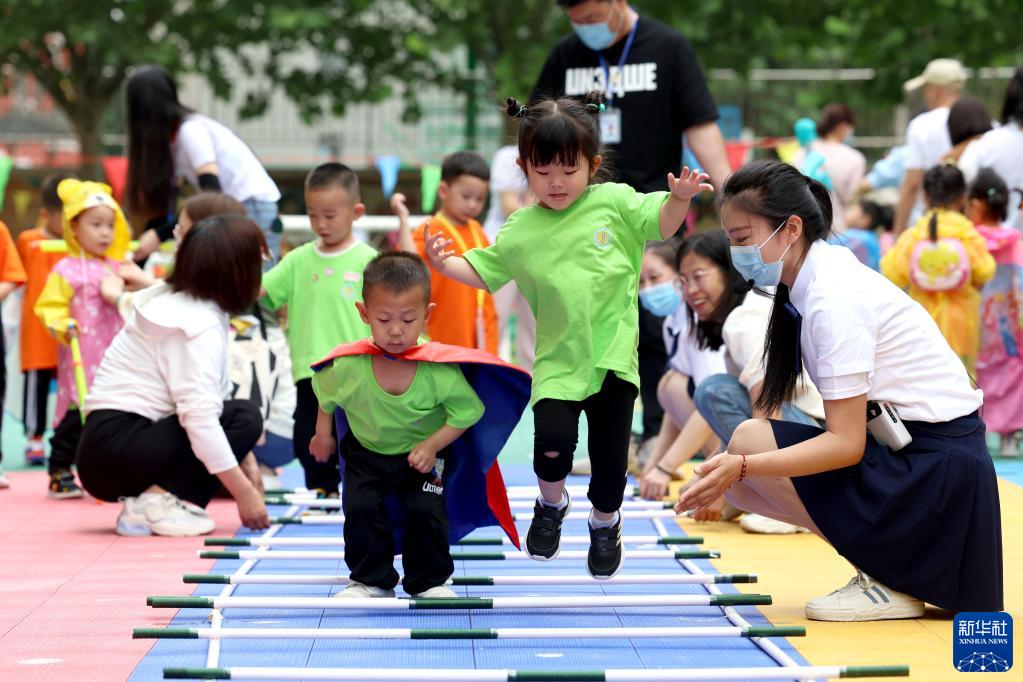 5月31日,在石家莊市長(cháng)安區第一幼兒園,孩子們進(jìn)行“快樂(lè )竹竿舞”游戲。
