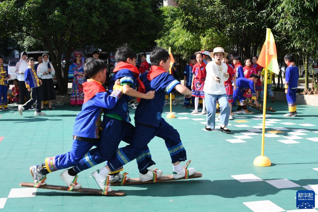 5月30日,在廣西羅城仫佬族自治縣第二小學(xué),學(xué)生參加板鞋接力比賽。