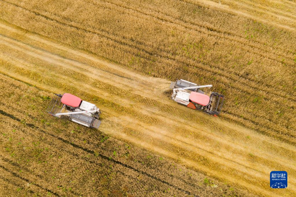 6月1日,在道場(chǎng)鄉施家橋村的麥田里,收割機在搶收小麥(無(wú)人機照片)。