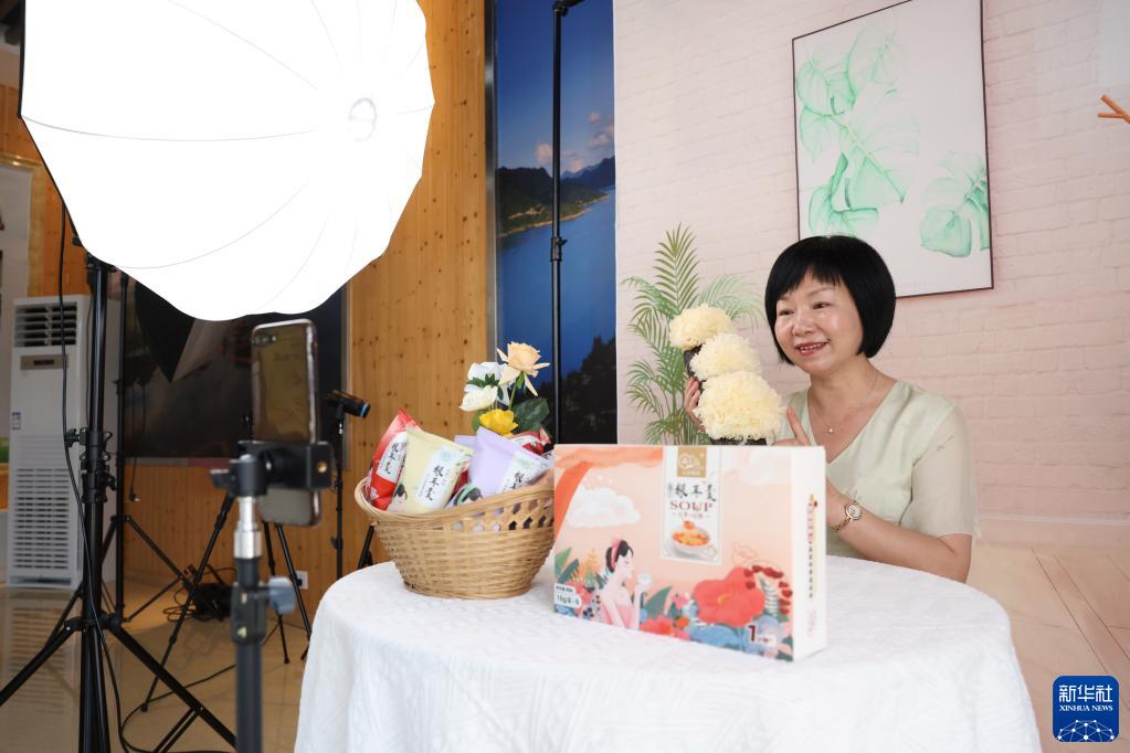 6月1日,福建古田晟農無(wú)公害銀耳基地負責人張家巧在直播銷(xiāo)售銀耳產(chǎn)品。