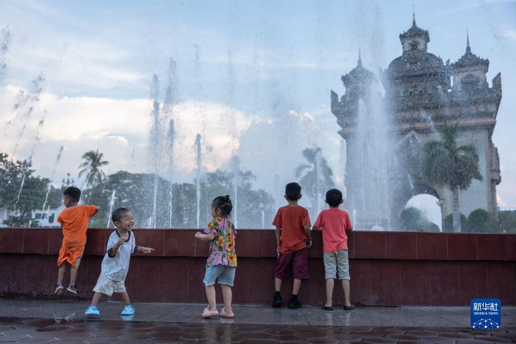 6月1日,孩子們在老撾首都萬(wàn)象的凱旋門(mén)邊觀(guān)賞噴泉,慶?!傲弧眹H兒童節。