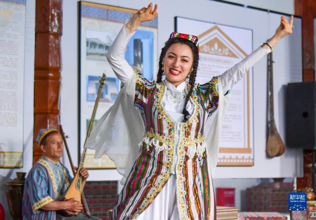 演員在新疆伊寧市喀贊其景區為游客表演“埃希來(lái)、葉來(lái)(一種烏茲別克族的民間傳統樂(lè )舞)”(5月18日攝)。