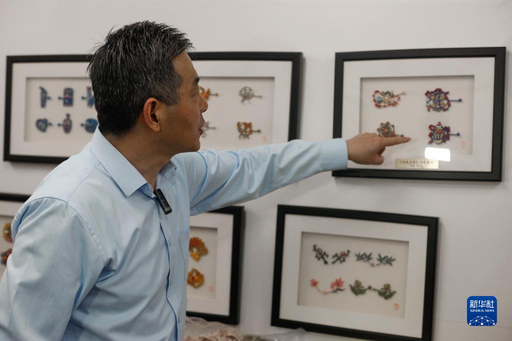 5月31日,江滿(mǎn)宗在上海市“龍鳳旗袍制作技藝——國家級非物質(zhì)文化遺產(chǎn)傳習所”介紹盤(pán)扣。