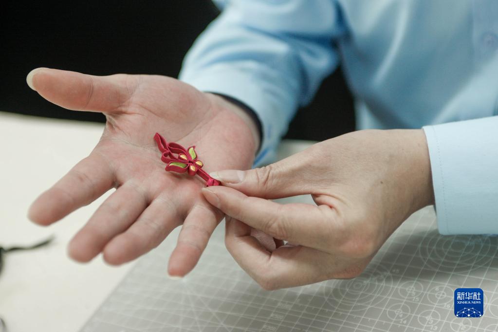 5月31日,江滿(mǎn)宗在上海市“龍鳳旗袍制作技藝——國家級非物質(zhì)文化遺產(chǎn)傳習所”展示盤(pán)扣。