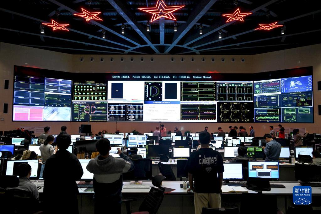 這是實(shí)驗成功后的全超導托卡馬克核聚變實(shí)驗裝置(EAST)控制大廳(2023年4月12日攝)。4月12日21時(shí),中國有“人造太陽(yáng)”之稱(chēng)的全超導托卡馬克核聚變實(shí)驗裝置(EAST)創(chuàng )造新的世界紀錄,成功實(shí)現穩態(tài)高約束模式等離子體運行403秒。