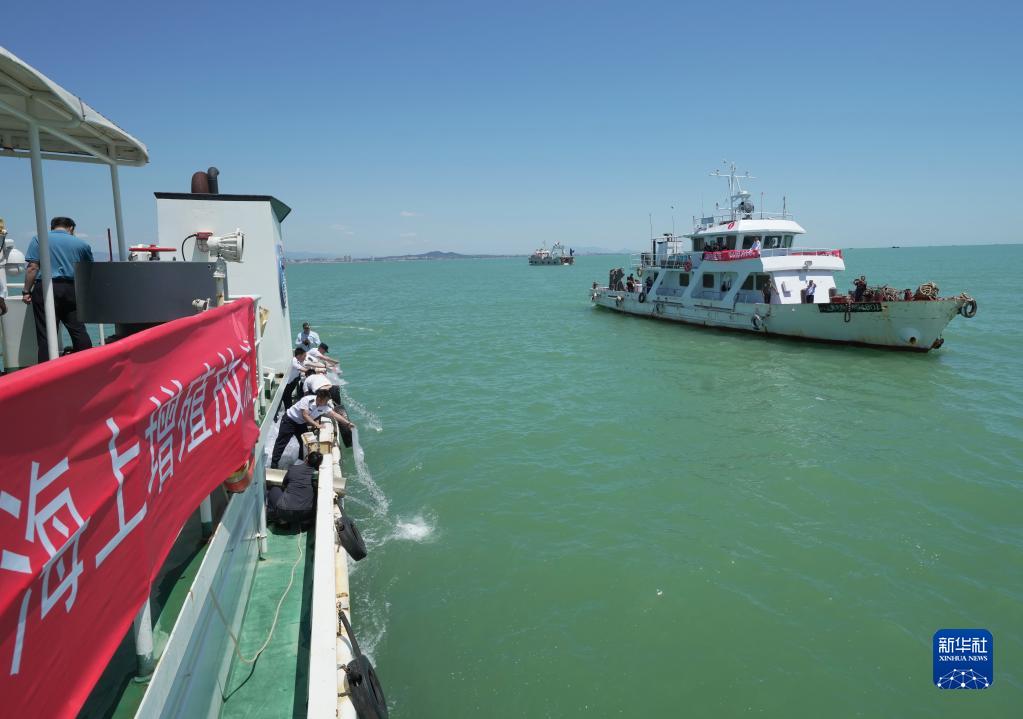 6月2日,參加增殖放流活動(dòng)的人員在秦皇島市北戴河新區海洋漁業(yè)資源增殖放流基地海域投放魚(yú)苗。