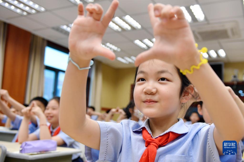 6月5日,浙江省湖州市長(cháng)興縣第一小學(xué),學(xué)生在縣疾控中心黨員志愿者的指導下利用互動(dòng)小游戲進(jìn)行優(yōu)勢眼檢查。