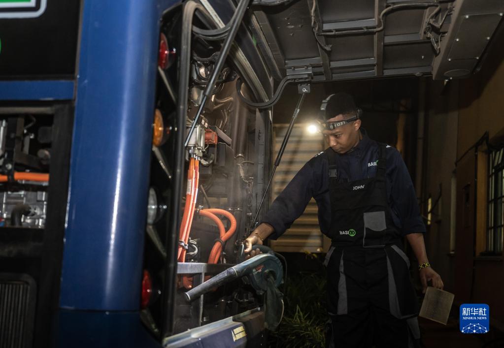 6月2日,在肯尼亞內羅畢,肯尼亞電動(dòng)巴士公司工作人員為電動(dòng)巴士除塵。