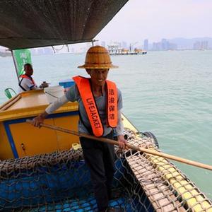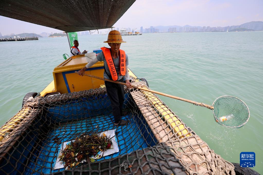 廈門(mén)海上環(huán)衛站小型保潔船上的環(huán)衛工人在收集海漂垃圾(6月4日攝)。