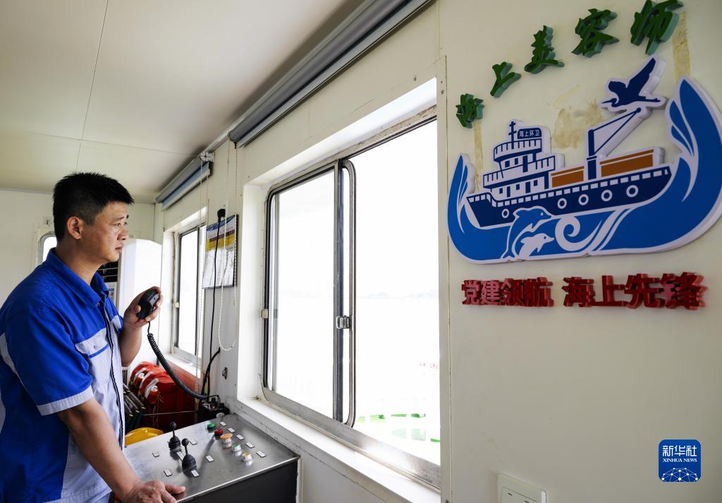在廈門(mén)市廈鼓海域,海上環(huán)衛工人在對海漂垃圾進(jìn)行機械化打撈清理(6月4日攝)。