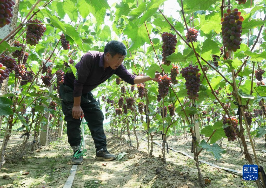 6月5日,盧龍縣木井鎮一名農民在大棚內管護即將成熟的葡萄。