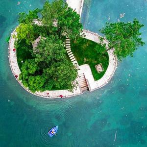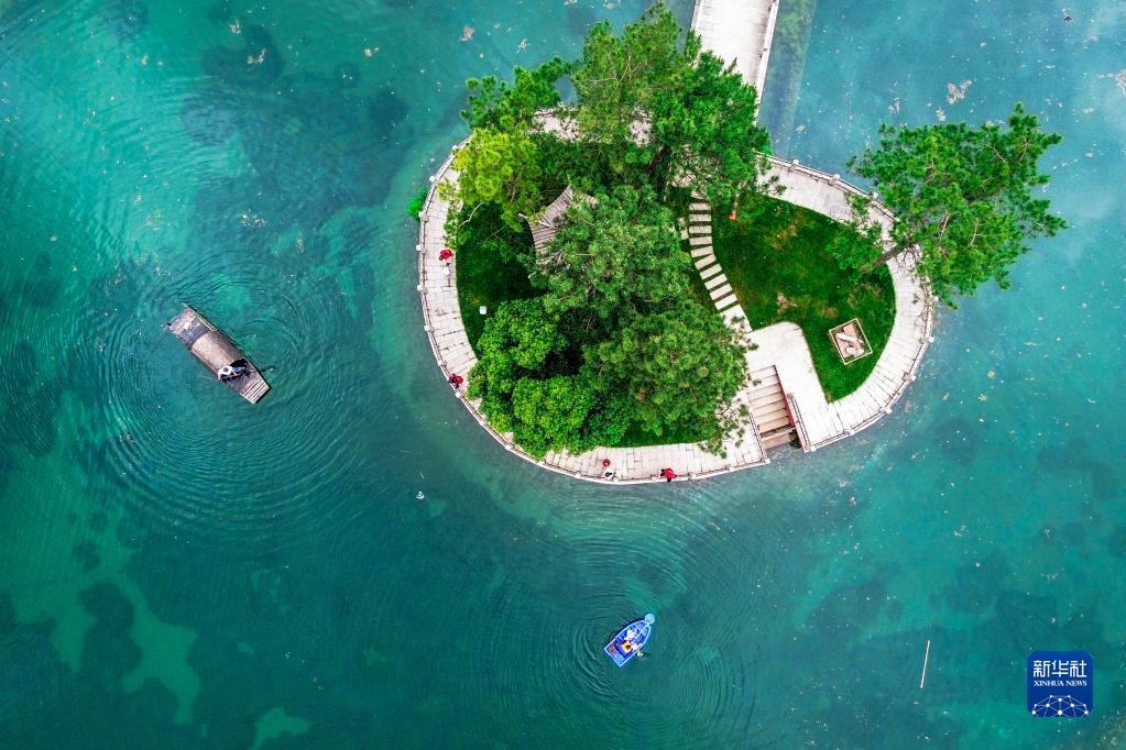 6月5日,浙江省湖州市長(cháng)興縣和平鎮長(cháng)崗村,黨員志愿者和村級河長(cháng)在打撈水面漂浮物、美化河岸(無(wú)人機照片)。