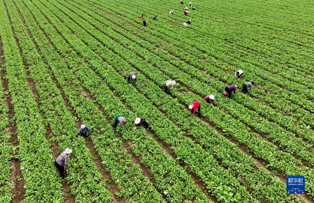 6月5日,在安徽省亳州市譙城區十河鎮佟營(yíng)村中藥材種植基地,農民在田間管護板藍根(無(wú)人機照片)。
