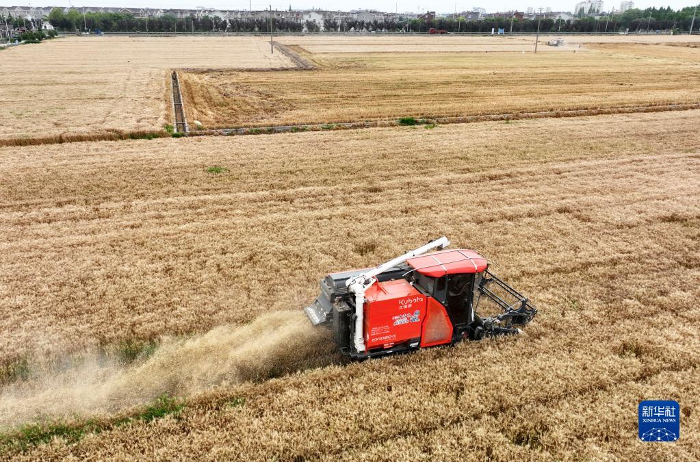 6月3日,在江蘇省太倉市雙鳳鎮勤力村,農機手駕駛收割機在田間搶收小麥(無(wú)人機照片)。