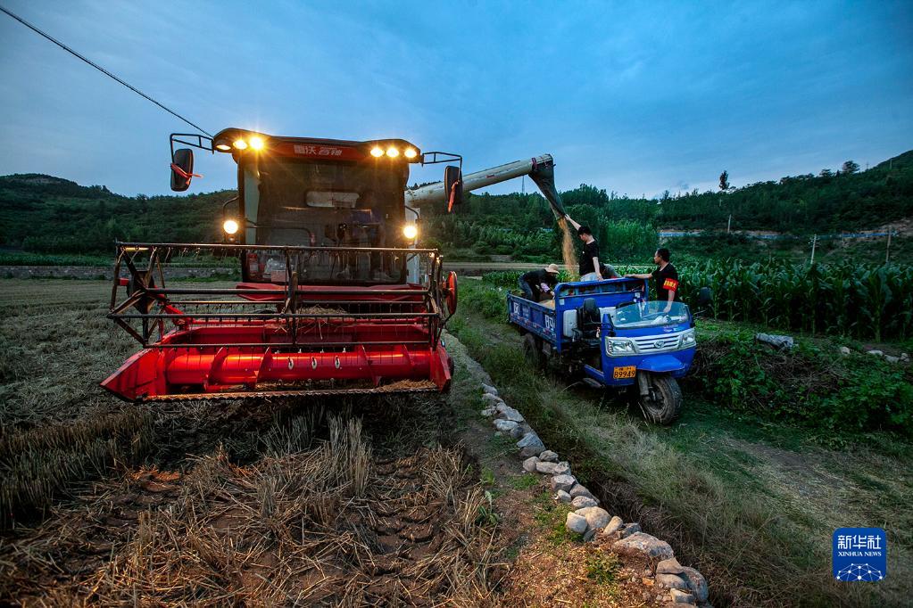 5月31日傍晚,在河南省焦作市博愛(ài)縣許良鎮下伏頭村,村民冒著(zhù)小雨搶收小麥。