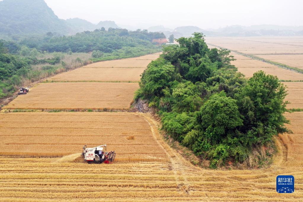 5月21日,在浙江省湖州市德清縣乾元鎮由廢棄礦坑改造的農田中,種植大戶(hù)趁晴好天氣駕駛收割機收獲小麥(無(wú)人機照片)。