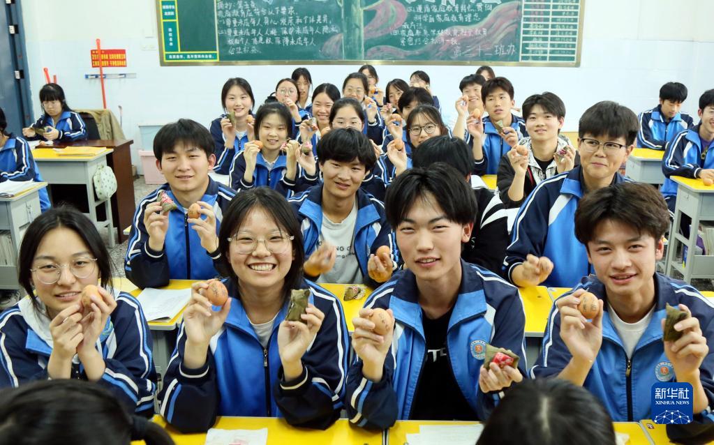 6月5日,河南省洛陽(yáng)市汝陽(yáng)縣第二高級中學(xué)學(xué)生收到學(xué)校送上的寫(xiě)有高考祝福語(yǔ)的雞蛋和粽子。