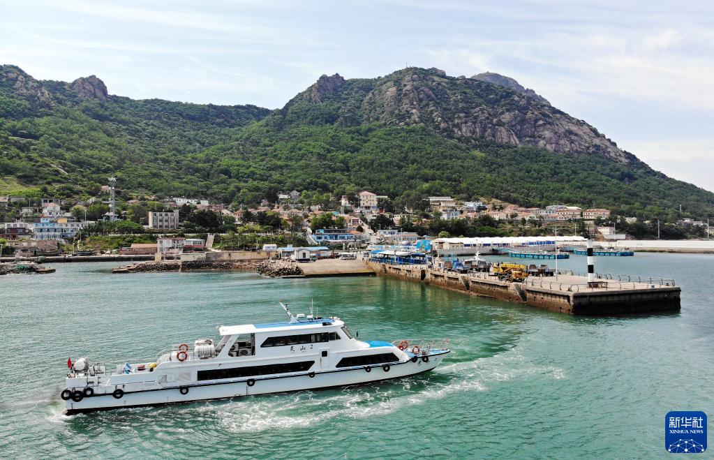 一艘快艇在靈山島省級自然保護區碼頭接送游客(6月5日攝,無(wú)人機照片)。