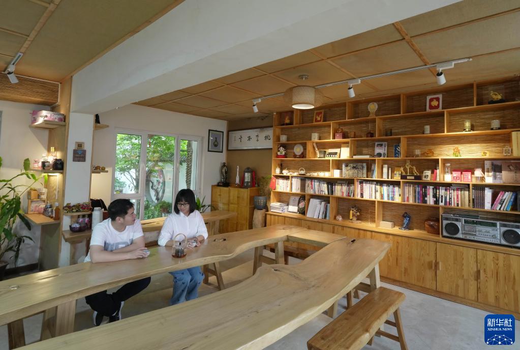 6月5日,游客在秦皇島市北戴河區費石莊村一家精品民宿的茶室內交流。