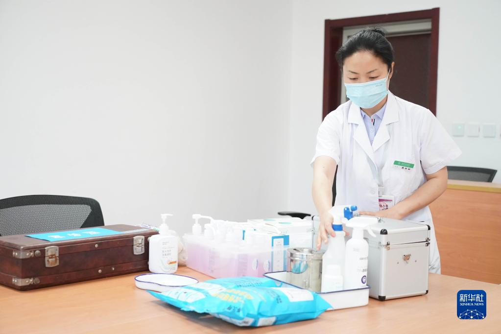6月6日,在中國農業(yè)大學(xué)附屬中學(xué)考點(diǎn),校醫在醫務(wù)室準備醫療用品。