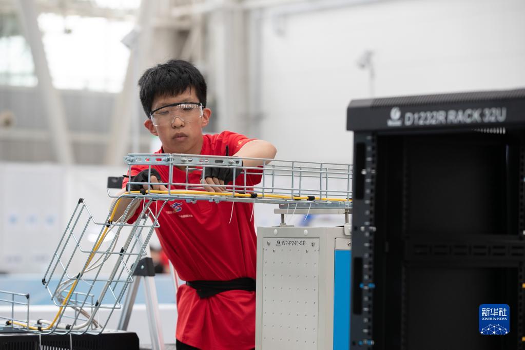 6月6日,選手在進(jìn)行信息網(wǎng)絡(luò )布線(xiàn)項目比賽。