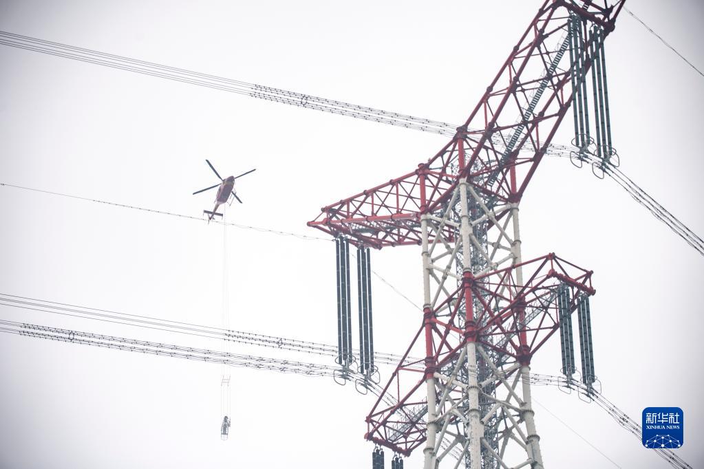 6月6日,在安徽蕪湖的長(cháng)江邊,直升機將檢修人員吊送至±800千伏建蘇線(xiàn)上進(jìn)行帶電作業(yè)。
