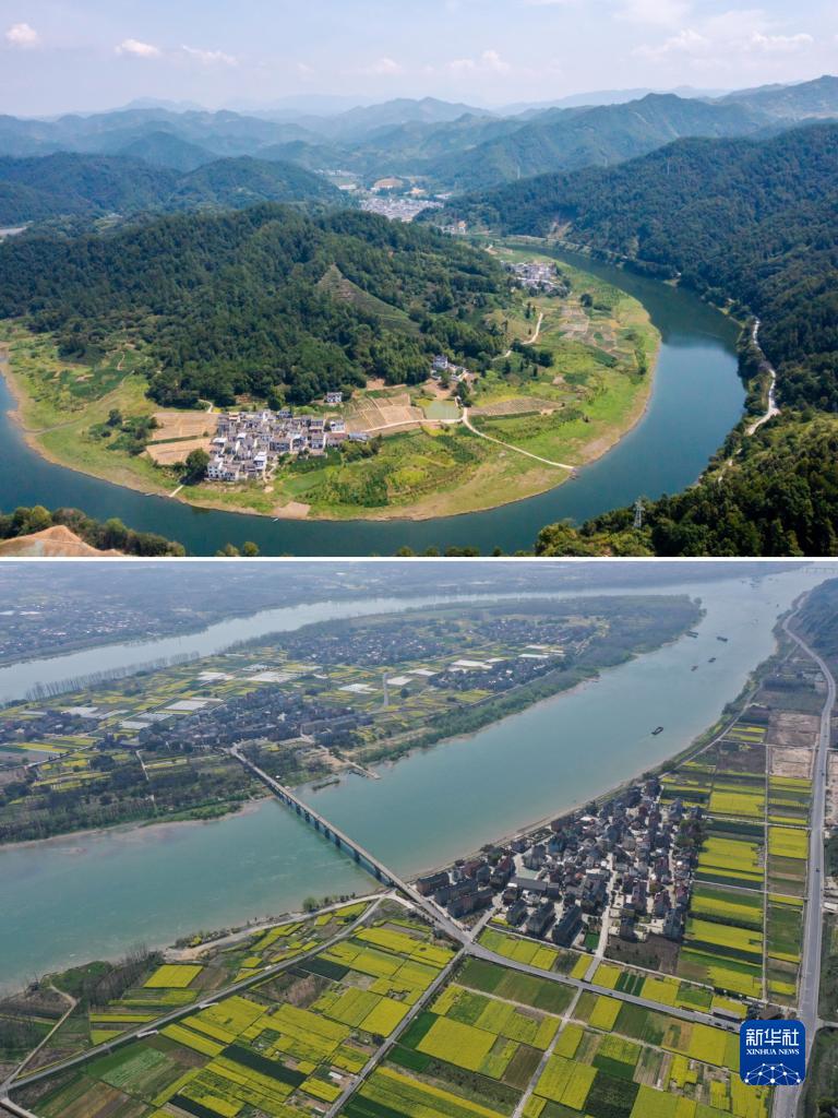 拼版照片:上圖為2022年8月10日拍攝的安徽省黃山市歙縣新安江風(fēng)景(無(wú)人機照片,新華社發(fā) 黃洋洋攝);下圖為2020年3月19日拍攝的浙江省杭州市富陽(yáng)區新桐鄉桐洲島景色(無(wú)人機照片,新華社記者黃宗治攝)。