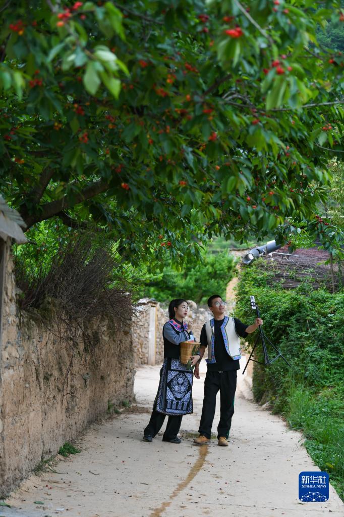 在四川省阿壩州汶川縣蘿卜寨村,王光強(右)和妻子黃月在櫻桃樹(shù)下直播(6月2日攝)。