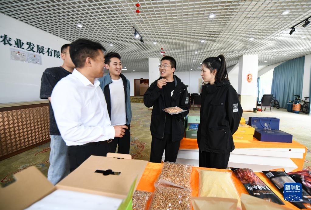 在四川省阿壩州茂縣當地一家農產(chǎn)品生產(chǎn)公司,王光強(右二)和妻子黃月(右一)與公司負責人一起商談合作(6月2日攝)。