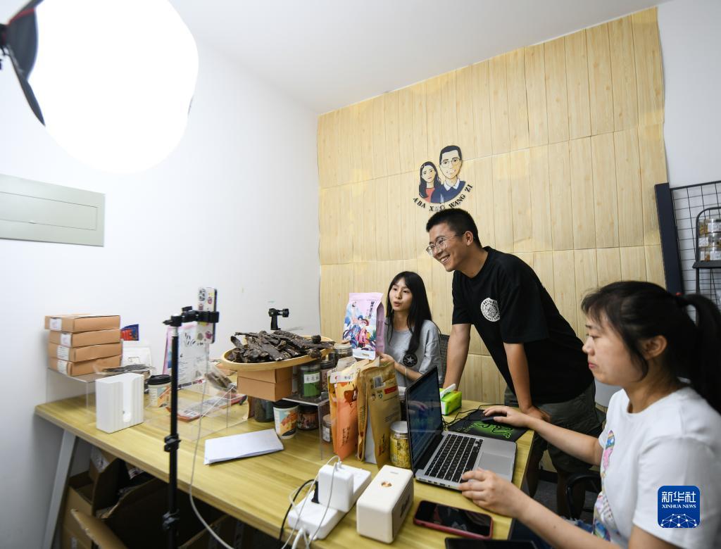 王光強(中)在成都的電商公司里和主播一起直播(6月1日攝)。