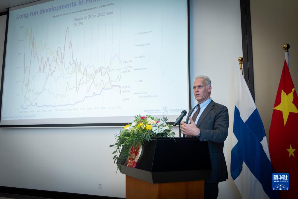6月5日,芬蘭銀行研究主管利卡·科爾霍寧在芬蘭赫爾辛基舉辦的以“回顧中芬互利合作70年,攜手面向未來(lái)”為主題的研討與慶?;顒?dòng)現場(chǎng)發(fā)言。