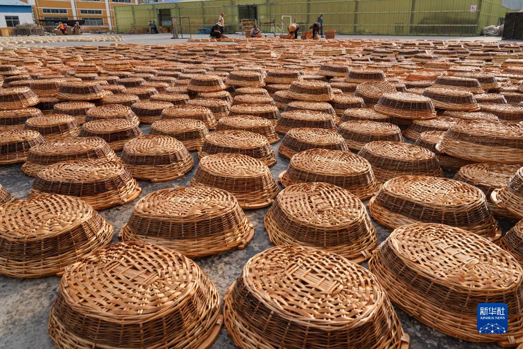 6月6日,臨沂金柳工藝品有限公司員工在晾曬柳編產(chǎn)品。