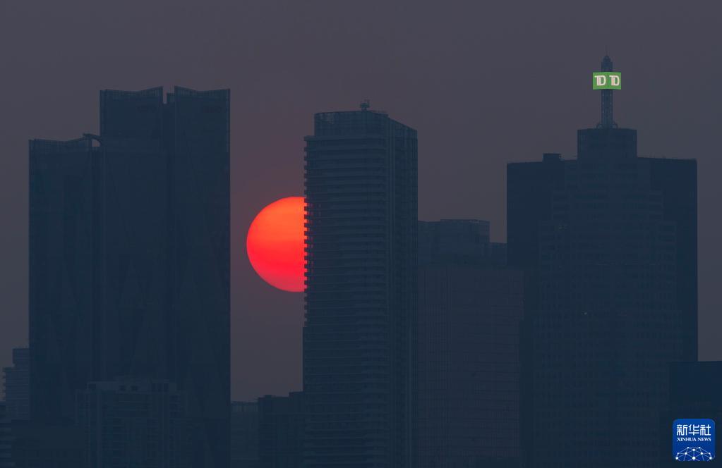 這是6月6日在加拿大多倫多拍攝的籠罩在煙塵中的落日。