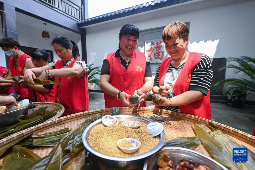 6月7日,在安華鎮球山村的愛(ài)心食堂里,志愿者在包粽子。