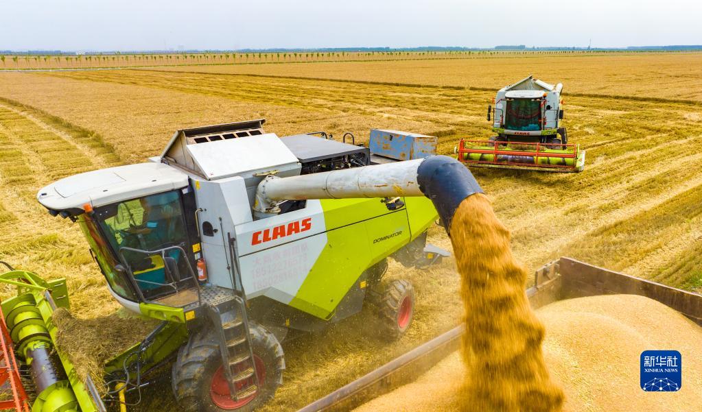6月7日,在河南省駐馬店市西平縣老王坡高標準農田,收割機將剛收獲的小麥裝車(chē)(無(wú)人機照片)。