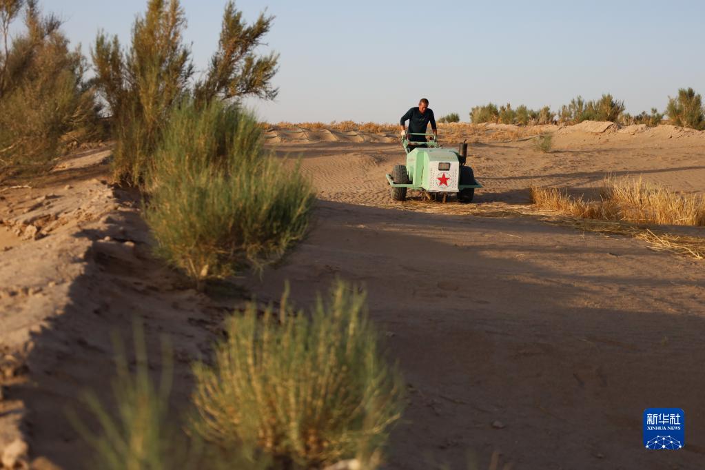 5月31日,武威市民勤縣薛百鎮農民使用新一代手扶式沙障機壓草方格。