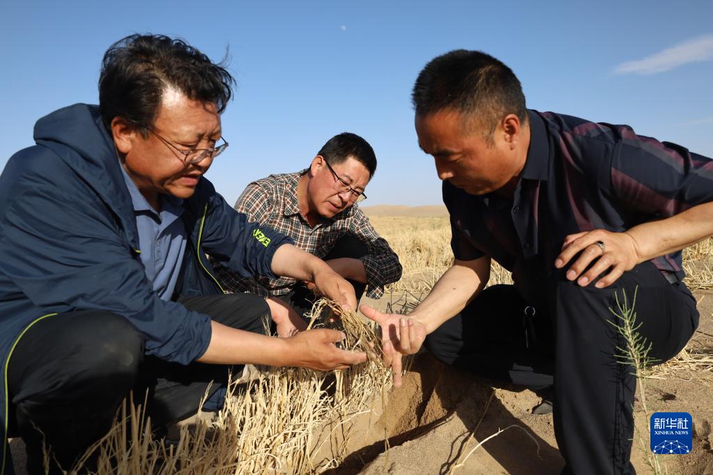5月31日,甘肅省治沙研究所科研人員在武威市民勤縣沙咀墩機械壓沙示范區查看草方格沙障情況。