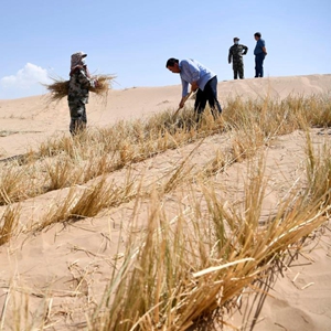 工作人員在白芨灘國家級自然保護區補扎草方格(6月7日攝)。