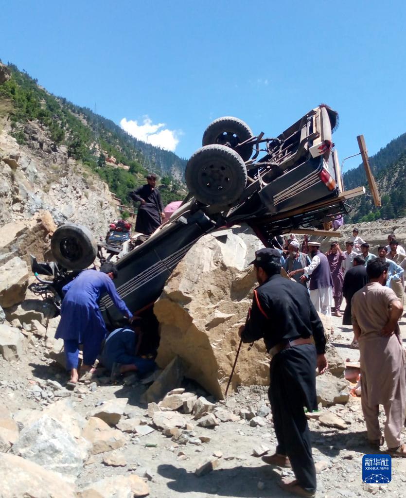 6月8日,在巴基斯坦開(kāi)伯爾-普什圖省的上迪爾地區,人們聚集在墜入峽谷的車(chē)輛周?chē)?/p>