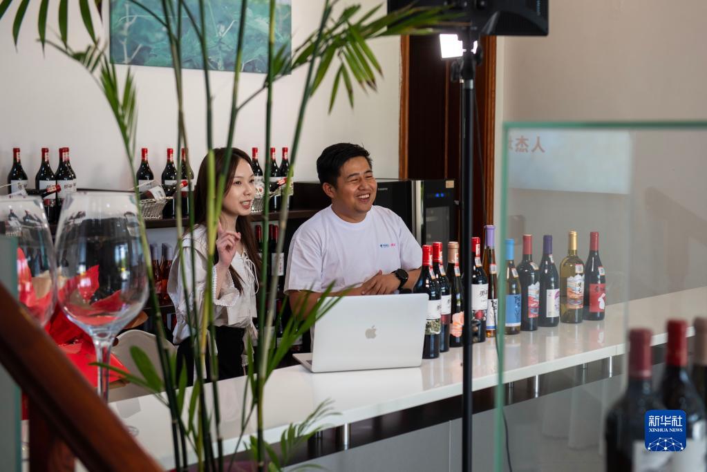 6月9日,主播在寧夏銀川市永寧縣一家葡萄酒莊直播銷(xiāo)售葡萄酒。