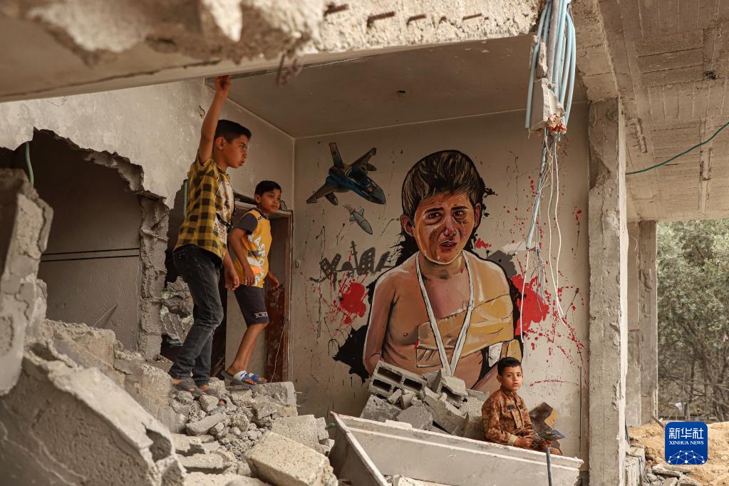 6月8日,兒童在加沙地帶中部一處難民營(yíng)附近畫(huà)有涂鴉的廢墟玩耍。