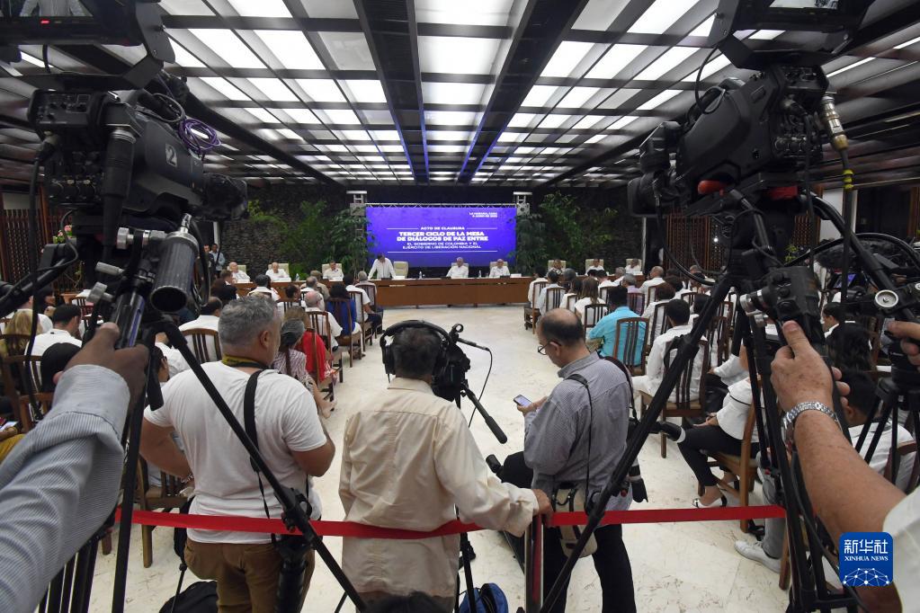 這是6月9日在古巴首都哈瓦那拍攝的哥倫比亞政府與反政府武裝“哥倫比亞民族解放軍”第三輪和談閉幕式現場(chǎng)。